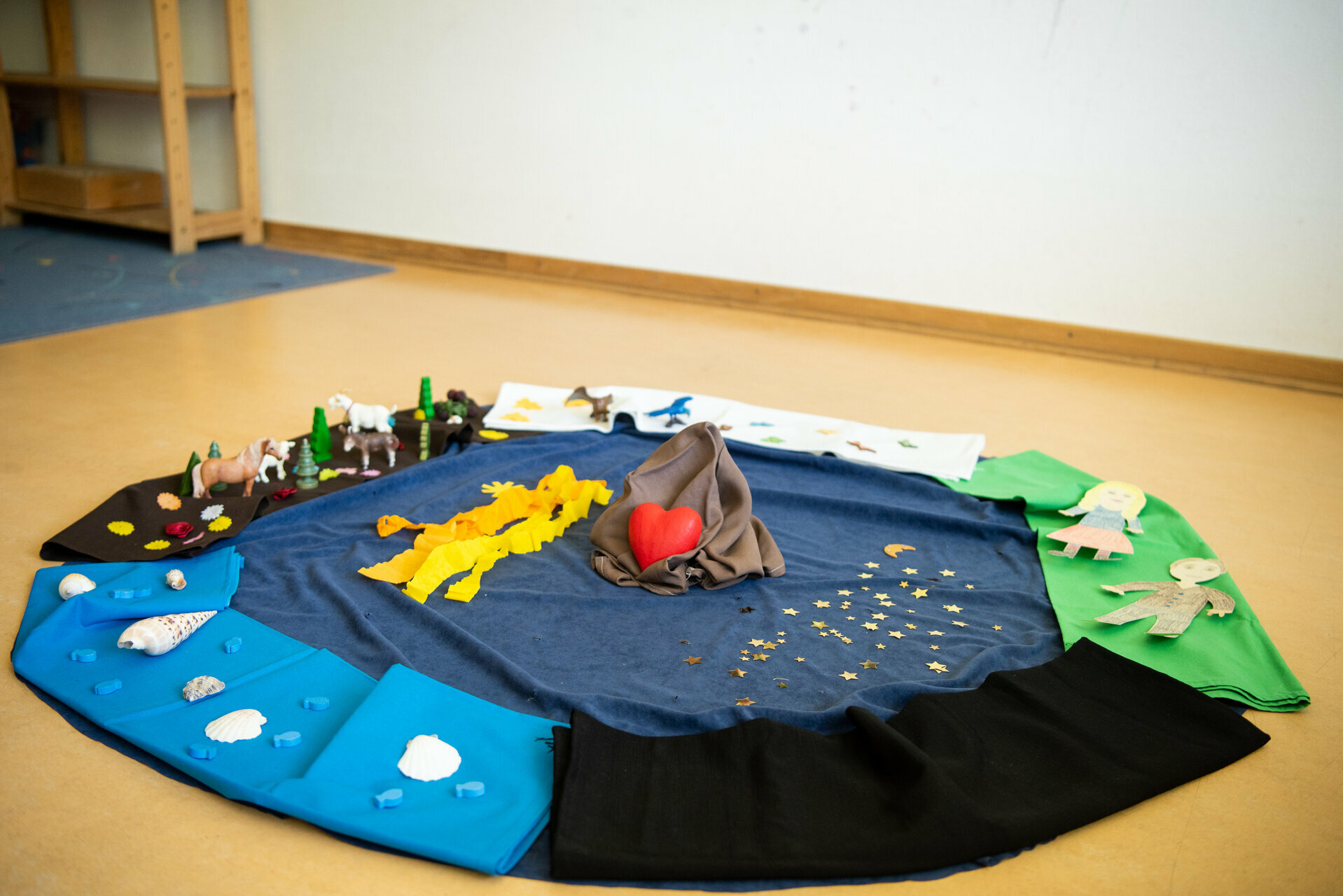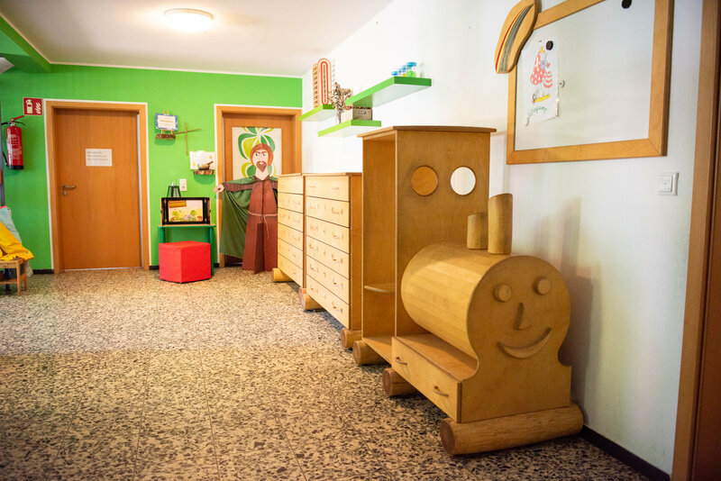 In unserer Einrichtung stehen die christlichen Werte im Mittelpunkt. Wir vermitteln den Kindern die Wichtigkeit der Lebensthemen. Das gute Miteinander, Helfen, Teilen und untereinander respektieren und wertschätzen, liegt uns sehr am Herzen und begleitet uns durch den Kitaalltag. Durch das gemeinsame Beten, Singen von religiösen Liedern und erzählen von biblischen Geschichten nach dem Religionspädagogen Franz Kett, werden Geschichten lebendig erzählt und mit Legematerialien gestaltet und vertieft. Auch das Kamishibai wird vielfältig eingesetzt. Die Kinder haben im Flurbereich einen Herzensort. Hier können sie Gott ganz nah sein, indem sie zu ihm beten, sprechen, besondere Dinge auf den Tisch legen, sich die Kinderbibel anschauen, oder einfach nur vor Ort sind. Geburtstage und Namenstage werden in der Kita gefeiert. An diesem Tag stehen die Kinder besonders im Mittelpunkt. Ein symbolisches Geschenk mit dem jeweiligen Namen oder Segensspruch wird ihnen überreicht. Durch regelmäßige Andachten mit unserer Gemeindereferentin (Kindersegnung, Palmsonntag, Abschlussfeier, Advent) und das feiern von religiösen Festen aus dem Jahreskreis, möchten wir ein Gemeinschaftsgefühl vermitteln. Die nahegelegene Kirche ein wichtiger Ort für die Kinder. Die Vorschulkinder erkunden thematisch die Räume der Kirche und setzten sich damit auseinander.