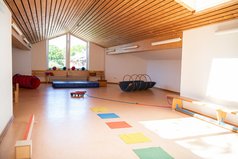 Auf der oberen Etage findet man den Bewegungsraum vor. Dieser Raum dient nicht nur für Bewegungseinheiten, sondern wird auch für viele unterschiedliche Aktionen, wie zum Beispiel Sprachspielgruppe, Schulkinder-Projekte, Elternabende, Andachten, Feste und sonstige Veranstaltungen genutzt.