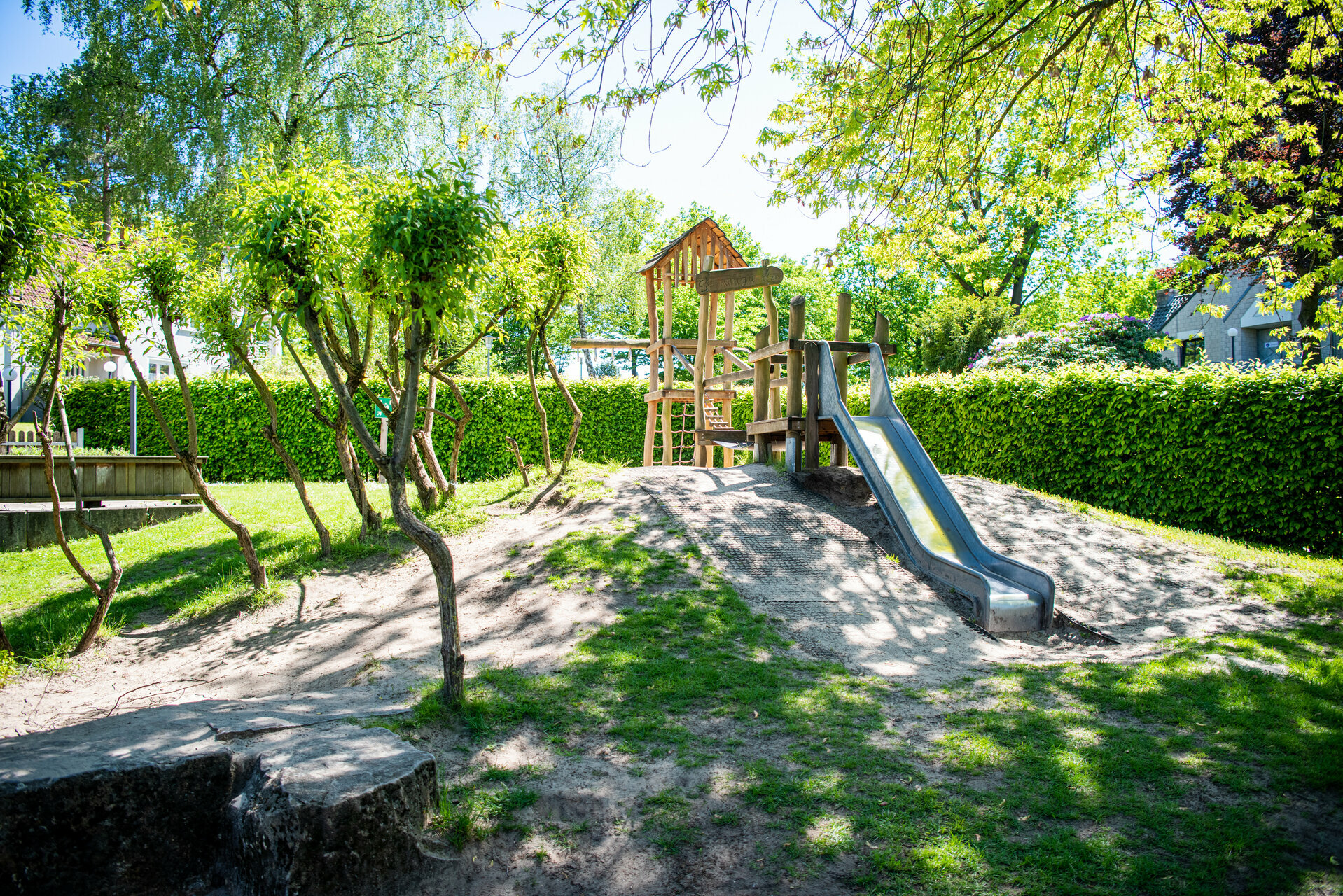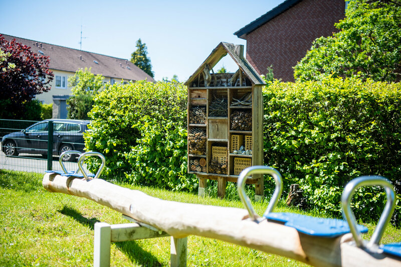 Unser Außengelände bietet rundherum vielfältige Spiel-und Bewegungsmöglichkeiten. Die Naturerfahrung ist ein wichtiger Bestandteil unserer Arbeit. Das Gärtnern an unseren Hochbeeten und das Beobachten der Tiere im Insektenhotel, ermöglicht den Kindern, sich mit vielen Themen auseinanderzusetzen.